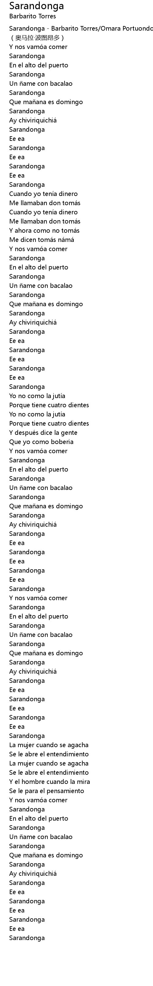 | [00:00.579] | Sarandonga Barbarito Torres Omara Portuondo ào mǎ lā bō tú áng duō |