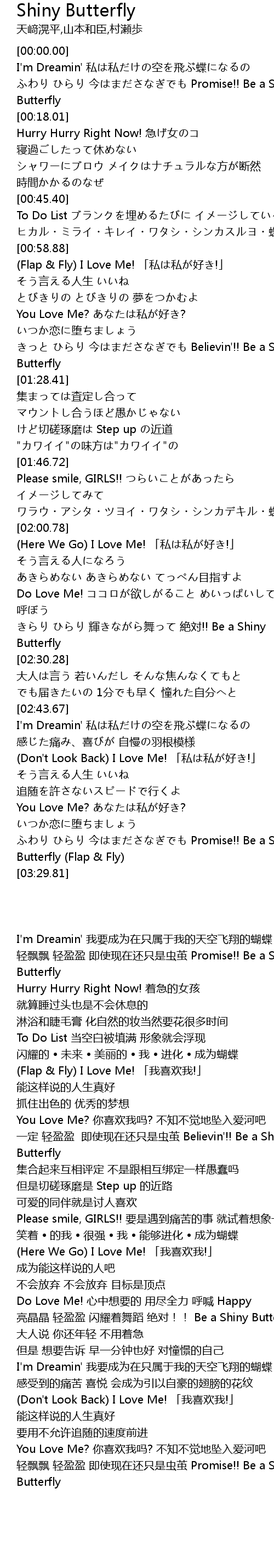 | [01:20.74] | きっと ひらり 今はまださなぎでも Believin'!! Be a Shiny Butterfly |