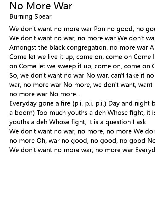 So, we don't want no war No war, can't take it no more We don't want no more war, no more war No more, we don't want, want no more war We don't want no, no, no more war No more... |