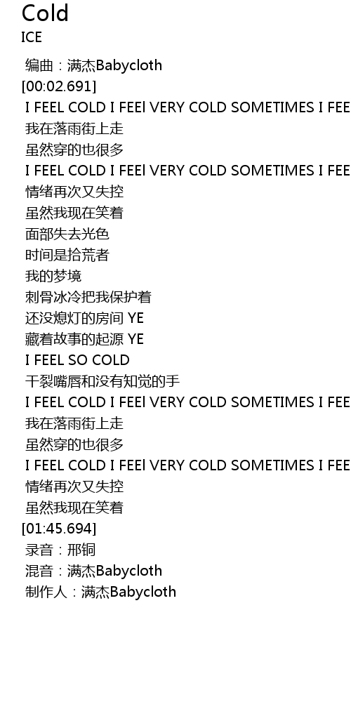 | [00:31.279] | I FEEL COLD I FEEl VERY COLD SOMETIMES I FEEL SO COLD |