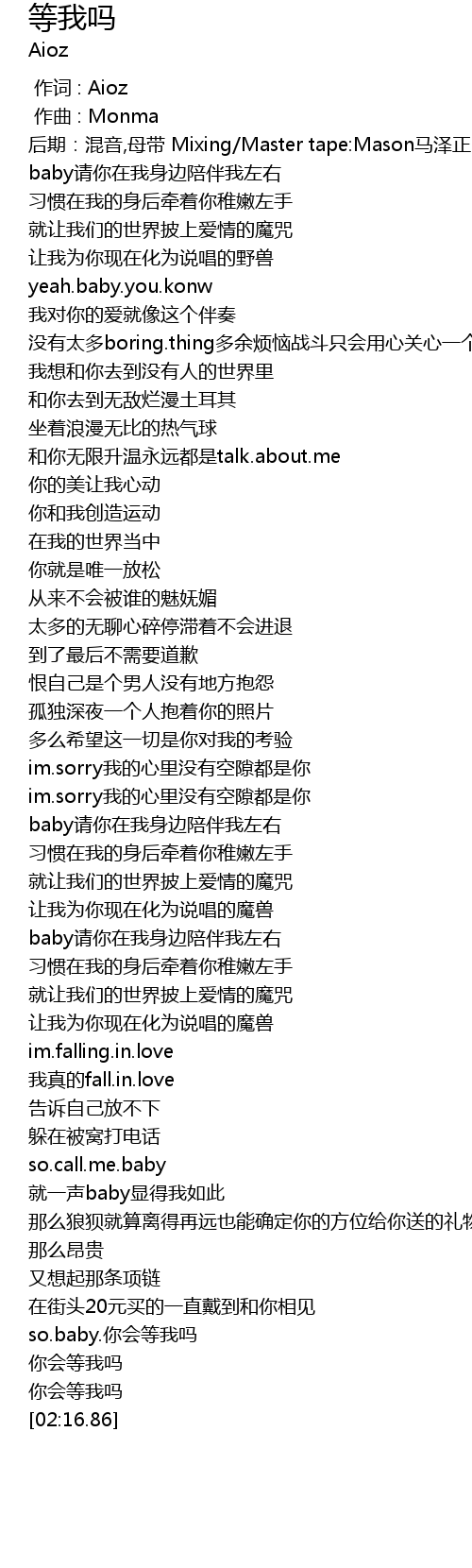 | [02:09.81] | so. baby. nǐ huì děng wǒ ma |