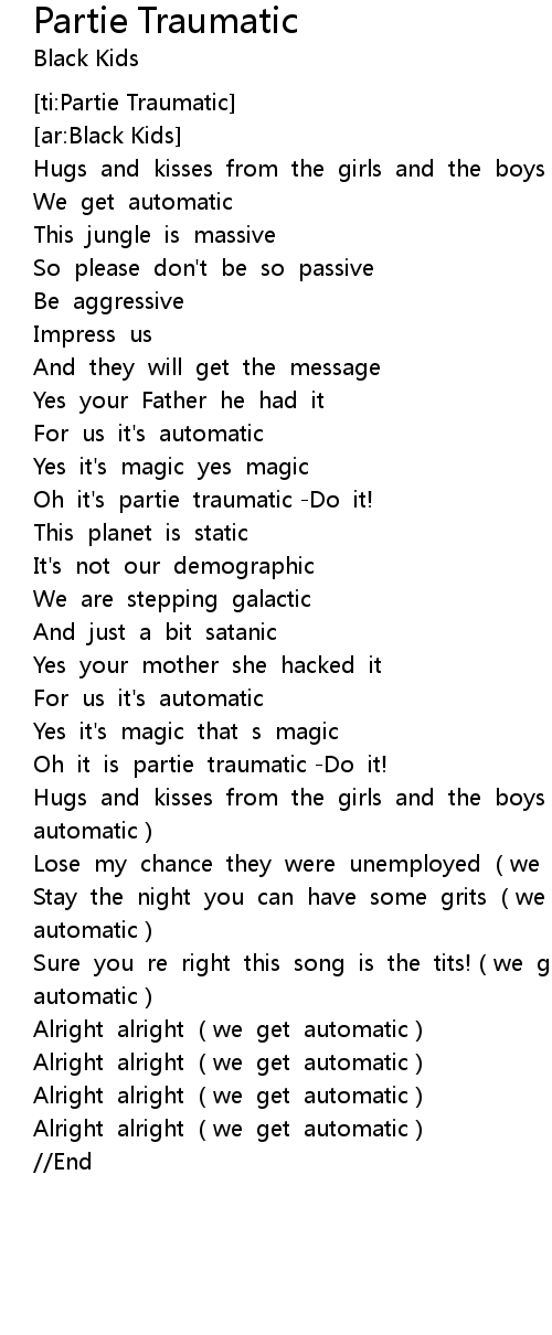 | [00:43.391] | Oh it' s partie traumatic Do it! |