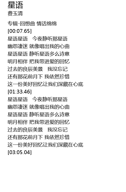 | [01:43.19] | 星语星语 今夜静听那星语 |