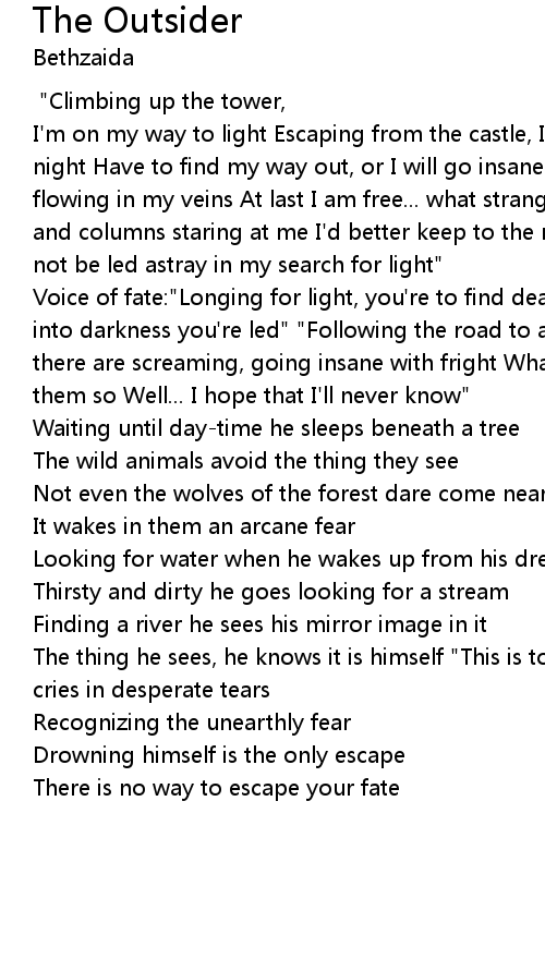 [Inspired by a short-story by H.P.Lovecraft (1890-1937)] "Climbing up the tower, I'm on my way to light Escaping from the castle, I've been locked up day and night Have to find my way out, or I will go insane Lust for light is leading me, flowing in my veins At last I am free... what strange things to see Marble slabs and columns staring at me I'd better keep to the road this dark night So I will not be led astray in my search for light" |