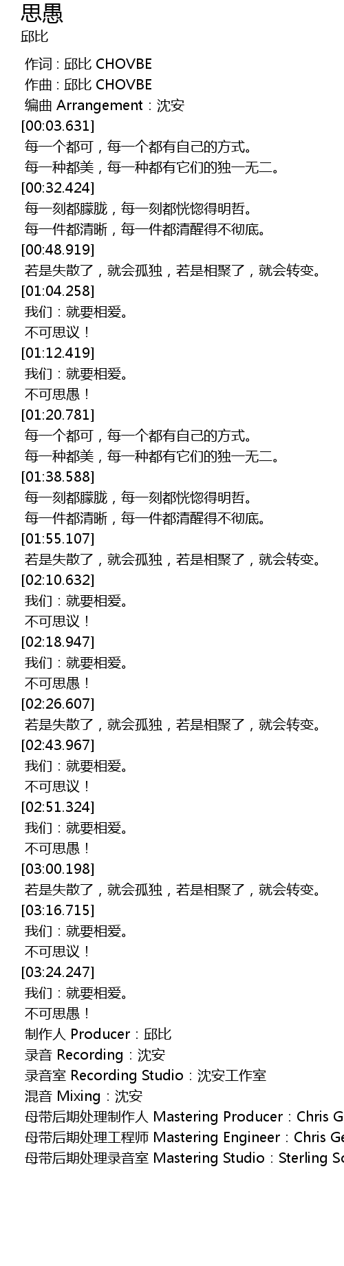 | [03:33.754] | 制作人 Producer:邱比 |