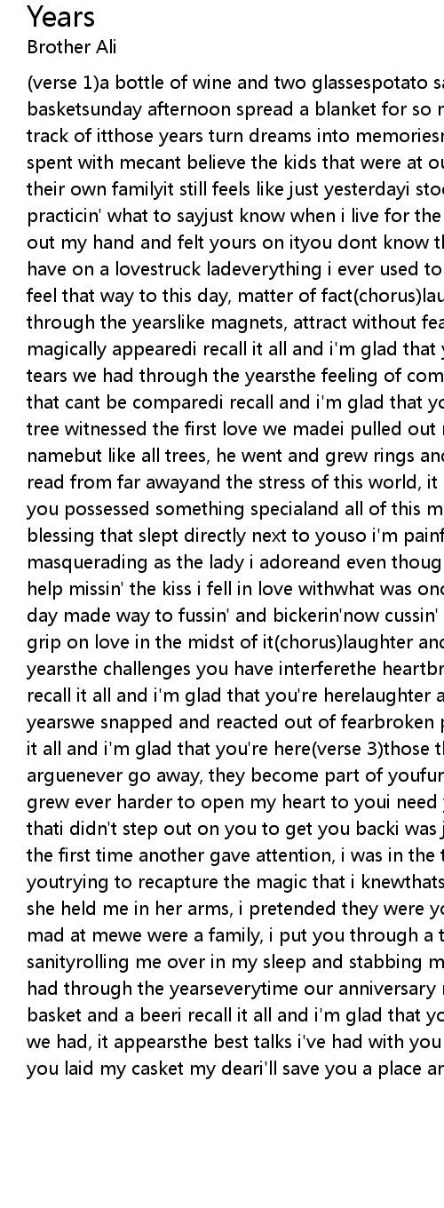 (verse 1)a bottle of wine and two glassespotato salad and that old picnic basketsunday afternoon spread a blanket for so many years that we tend to lose track of itthose years turn dreams into memoriesmuch oblige for every one you spent with mecant believe the kids that were at our feet all moved out and began their own familyit still feels like just yesterdayi stood in that mirror practicin' what to sayjust know when i live for the momentmy eyes glowed, held out my hand and felt yours on ityou dont know the power a touch like thatyou have on a lovestruck ladeverything i ever used to care about fade to the backi feel that way to this day, matter of fact(chorus)laughter and tears we had through the yearslike magnets, attract without fearthe sun ..light that magically appearedi recall it all and i'm glad that you're herelaughter and tears we had through the yearsthe feeling of companion is nearthe first touch, that cant be comparedi recall and i'm glad that you're here(verse 2)that old tree witnessed the first love we madei pulled out my pocket knife, gave it my namebut like all trees, he went and grew rings and that carving got harder to read from far awayand the stress of this world, it pressed youmade you forget you possessed something specialand all of this mess, you tended to neglect the blessing that slept directly next to youso i'm painfully ignored by a girl masquerading as the lady i adoreand even though i lived as your husbandi cant help missin' the kiss i fell in love withwhat was once huggin' and kissin'one day made way to fussin' and bickerin'now cussin' and no one's listenin'lost all grip on love in the midst of it(chorus)laughter and tears we had through the yearsthe challenges you have interferethe heartbreak and anguish we sharedi recall it all and i'm glad that you're herelaughter and tears we had through the yearswe snapped and reacted out of fearbroken promises can't be repairedi recall it all and i'm glad that you're here(verse 3)those things that we say when we arguenever go away, they become part of youfurthermore with every new scar it grew ever harder to open my heart to youi need you to believe me when i tell you thati didn't step out on you to get you backi was just hungry for affection that the first time another gave attention, i was in the trapi let her stand in for youtrying to recapture the magic that i knewthats why i fell for it becausewhen she held me in her arms, i pretended they were yoursi dont fault you for being mad at mewe were a family, i put you through a tragedycan't blame you for losing sanityrolling me over in my sleep and stabbing me(chorus)laughter and tears we had through the yearseverytime our anniversary nearsyou show up with a picnic basket and a beeri recall it all and i'm glad that you're herelaughter and tears we had, it appearsthe best talks i've had with you in yearsare right here where you laid my casket my deari'll save you a place and catch you when you're here |