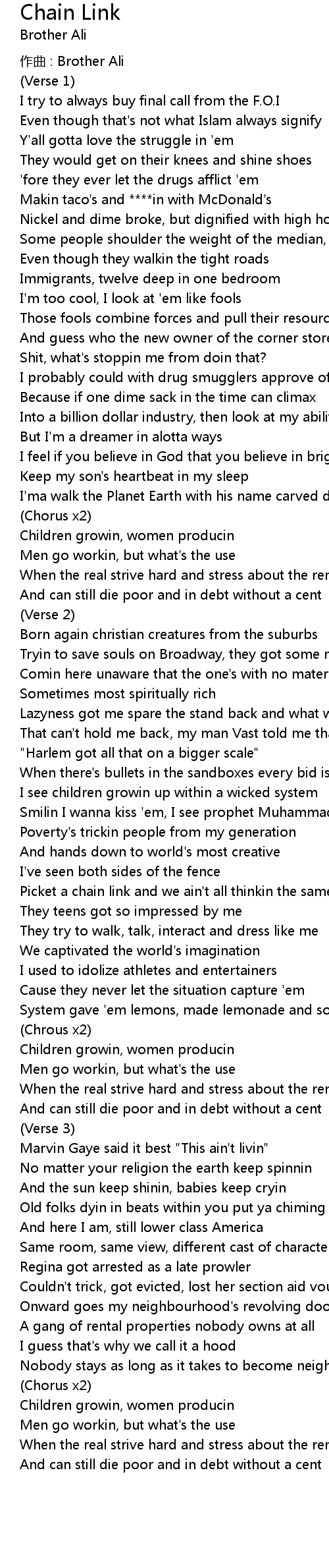 | Picket a chain link and we ain' t all thinkin the same thing but | |