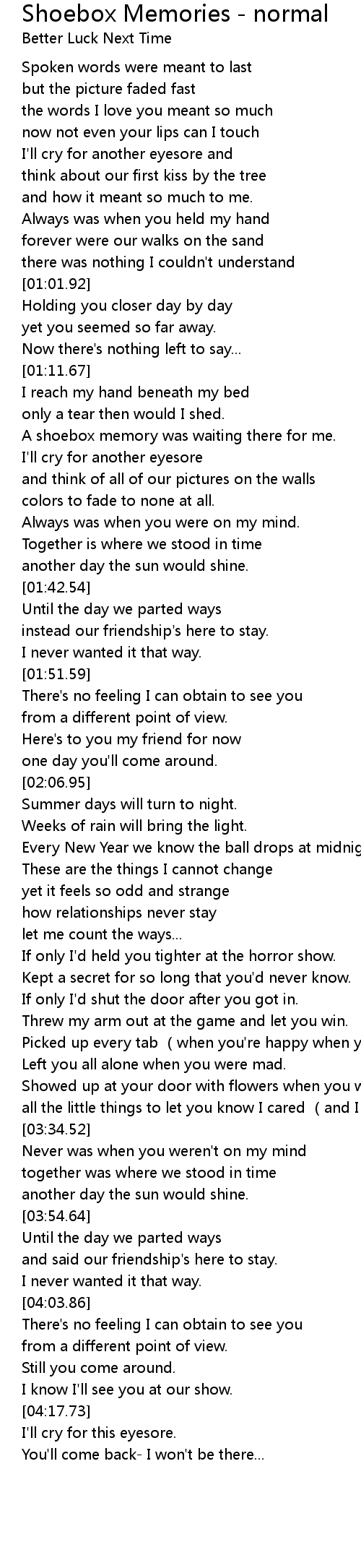 | [01:20.39] | A shoebox memory was waiting there for me. |