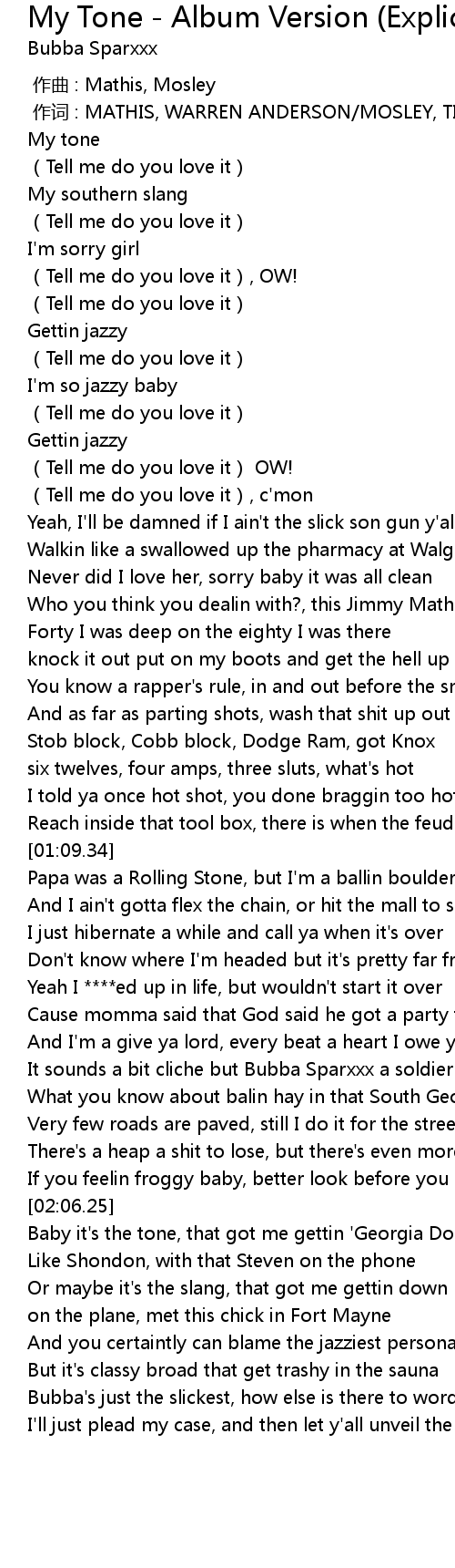 | [02:29.44] | Baby it' s the tone, that got me gettin ' Georgia Dome' |