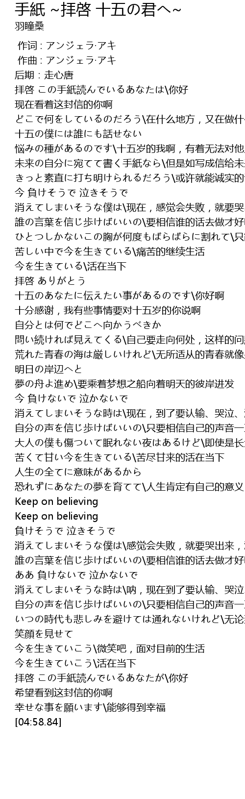 | [04:42.12] | 拝啓 この手紙読んでいるあなたが\你好 希望看到这封信的你啊 |