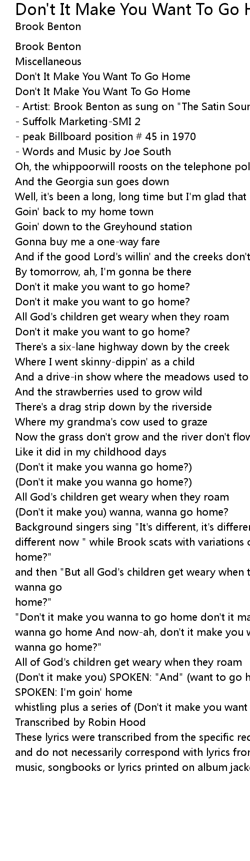 wanna go home And now-ah, don't it make you wanna go home, don't it make you |