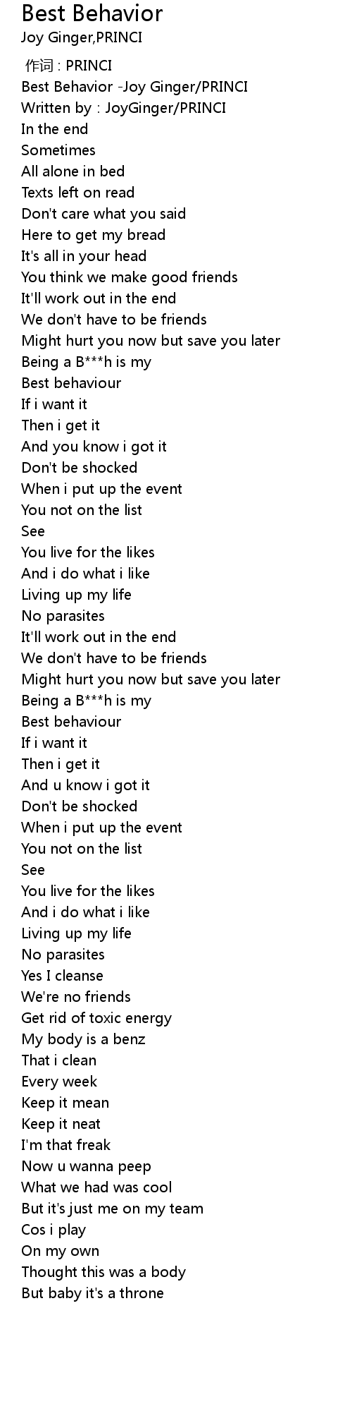| [00:01.02] | Best Behavior Joy Ginger PRINCI |