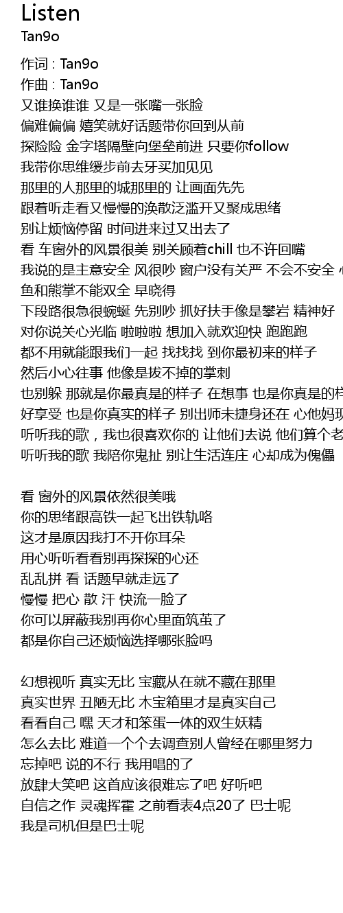 | 听听我的歌,我也很喜欢你的 让他们去说 他们算个老几呢 听听我的歌 我陪你鬼扯 别让生活连庄 心却成为傀儡 | |