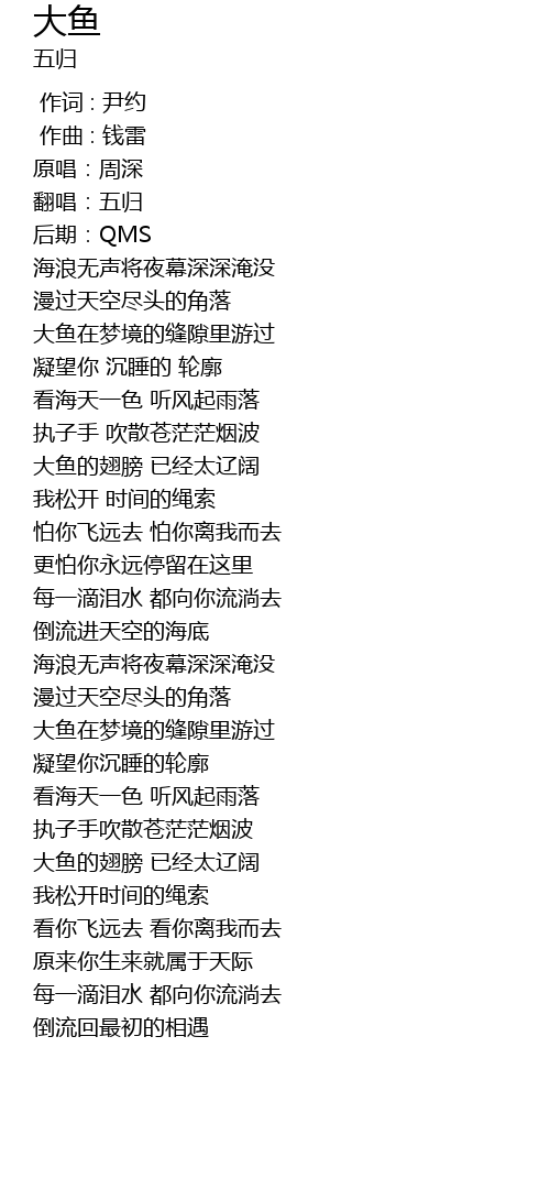 | [01:28.304] | 大鱼的翅膀 已经太辽阔 |