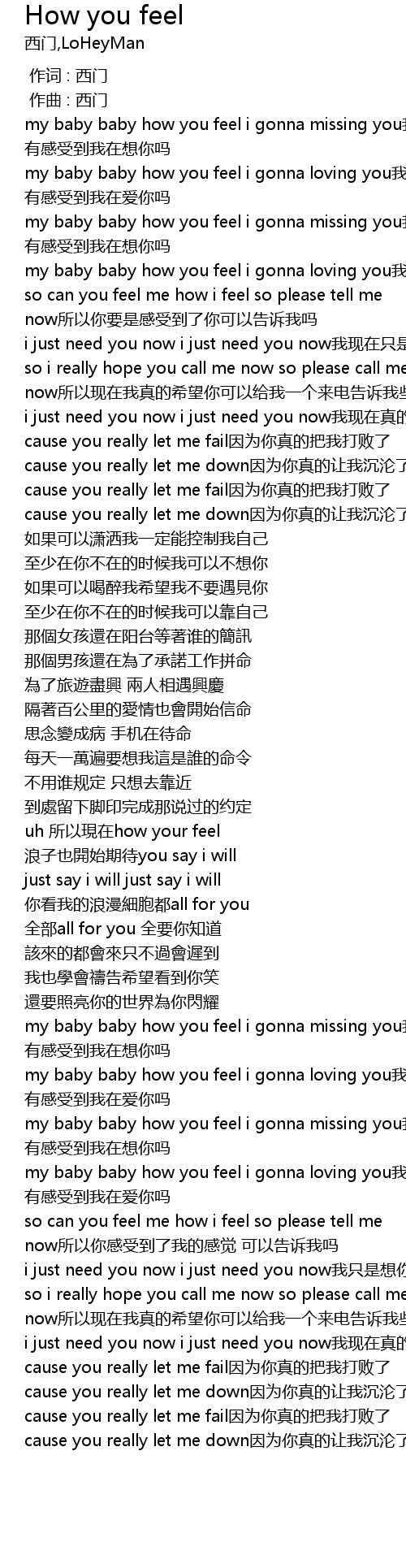 | [01:58.654] | uh suo yi xian zai how your feel |