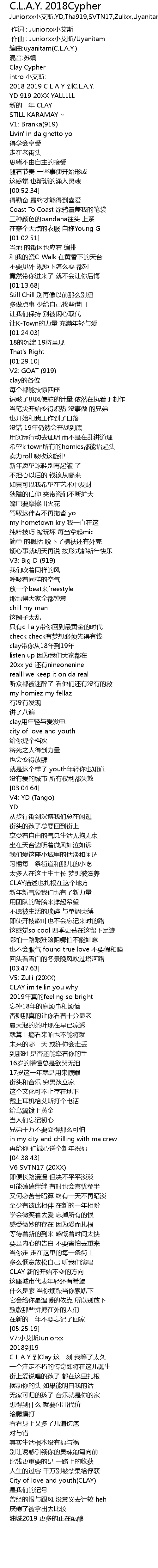 | [00:06.60] | 2018 2019 C L A Y 到C.L.A.Y. |
