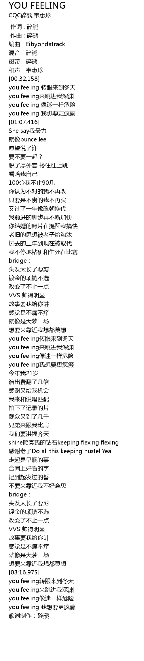| [02:16.788] | you feeling xiàng mí yí yàng wēi xiǎn |
