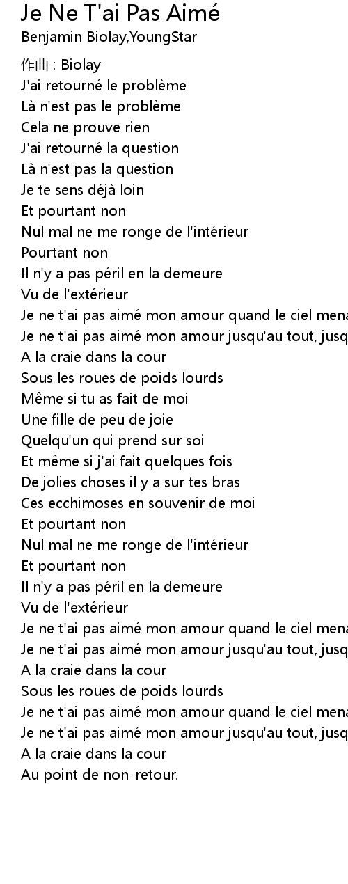 | Je ne t' ai pas aime mon amour jusqu' au tout, jusqu' au tout dernier jour | |