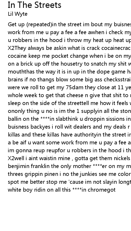 Get up (repeated)in the street im bout my buisness how i be a be aif u want some work from me u pay a fee a fee awhen i check my crackhouse im gonna reup reupfor u robbers in the hood i throw my heat up heat up |