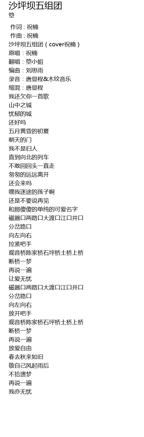 | [00:03.56] | 沙坪坝五组团(cover祝楠) |