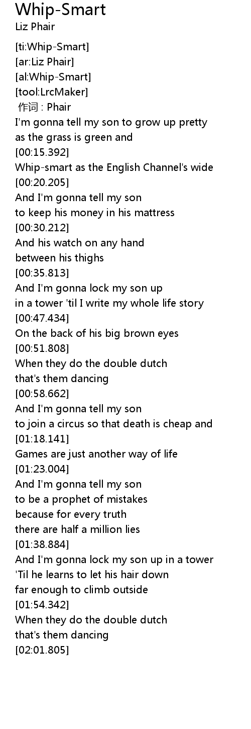 | [00:15.992] | Whipsmart as the English Channel' s wide |