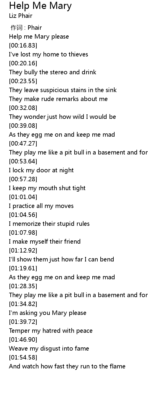| [00:14.28] | Help me Mary please |