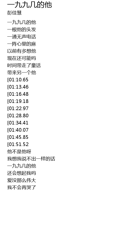 | [00:24.54] | yī jiǔ jiǔ jǐ de tā |