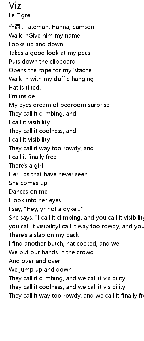 | She says, " I call it climbing, and you call it visibilityI call it coolness, and you call it visibilityI call it way too rowdy, and you call it finally free" | |
