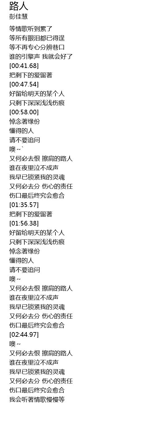 | [02:17.95] | 又何必去恨 擦肩的路人 |