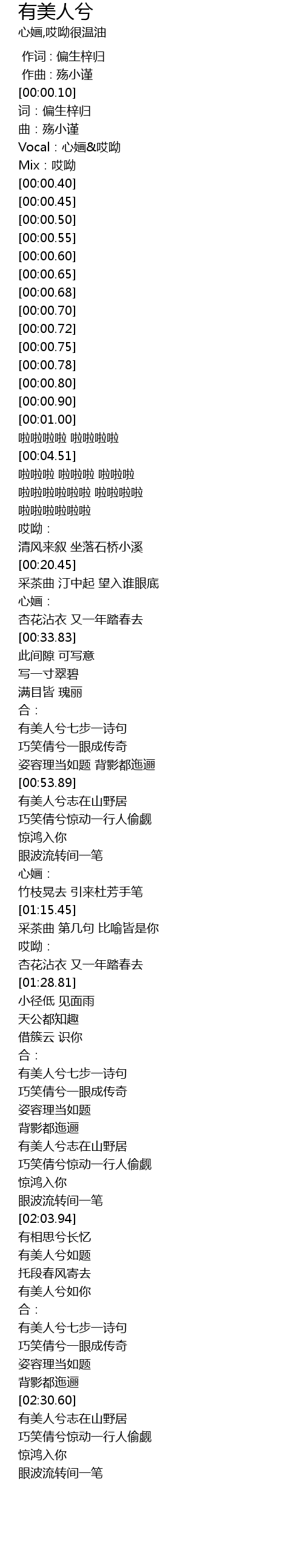 | [01:39.81] | 巧笑倩兮一眼成传奇 |