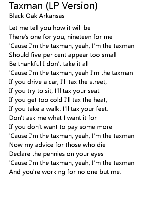 'Cause I'm the taxman, yeah, I'm the taxman |