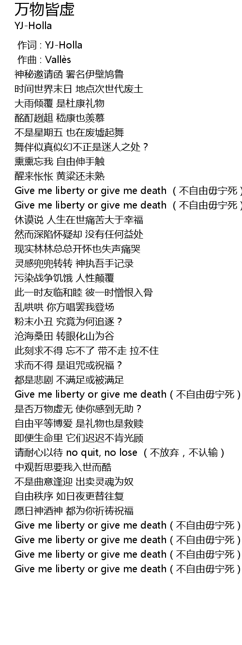 | [00:46.692] | Give me liberty or give me death bù zì yóu wú nìng sǐ |