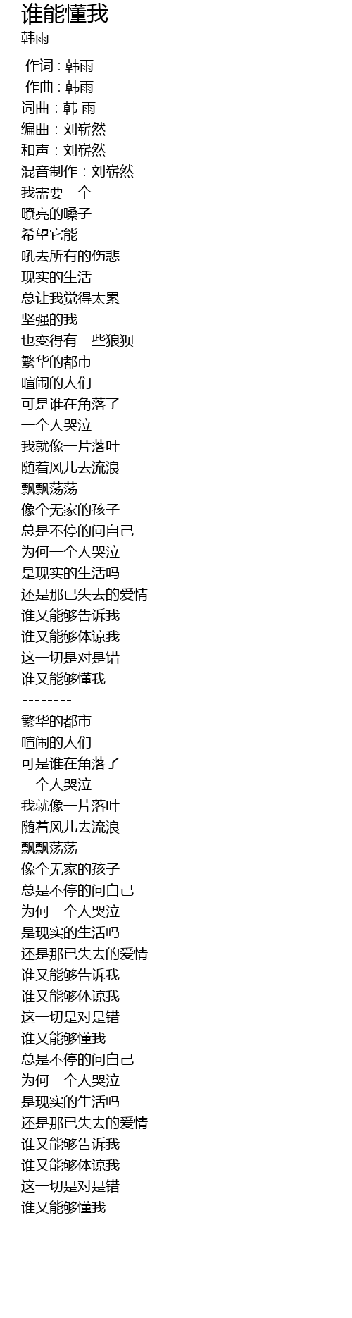 | [00:14.150] | 词曲:韩 雨 |