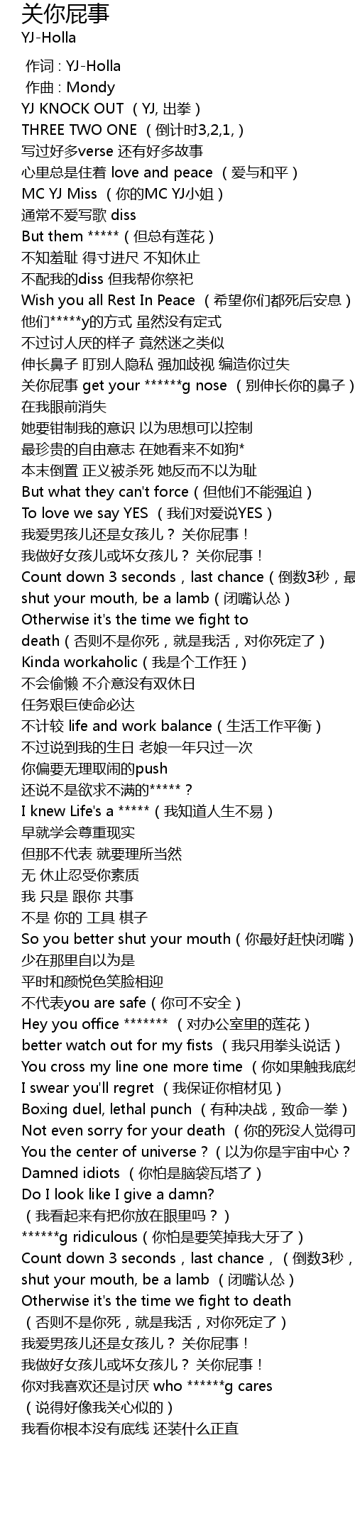 | [00:44.197] | 关你屁事 get your ******g nose (别伸长你的鼻子) |