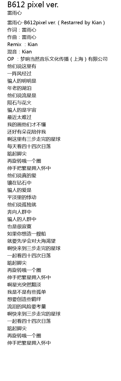 | [00:00.00] | 雷雨心-B612pixel ver.(Restarred by Kian) |