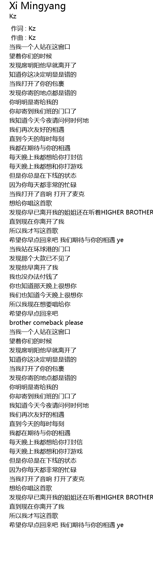 | [02:40.111] | fa xian ni zao yi li kai wo de jie jie hai zai ting zhe HIGHER BROTHERS |