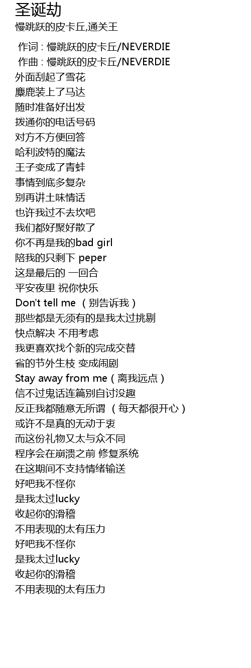 | [00:01.000] | 作曲 : 慢跳跃的皮卡丘/NEVERDIE |