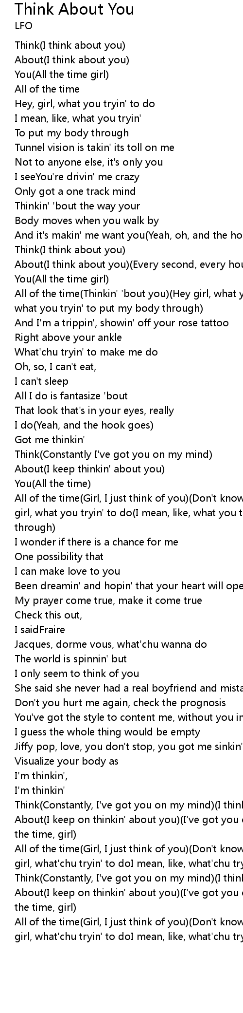 | All of the time(Girl, I just think of you)(Don't know what else to do)(Hey, girl, what you tryin' to do(I mean, like, what you tryin' to put my body through) | |