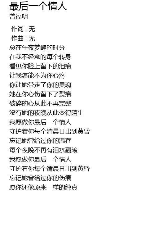 | [01:17.414] | 我愿做你最后一个情人 |