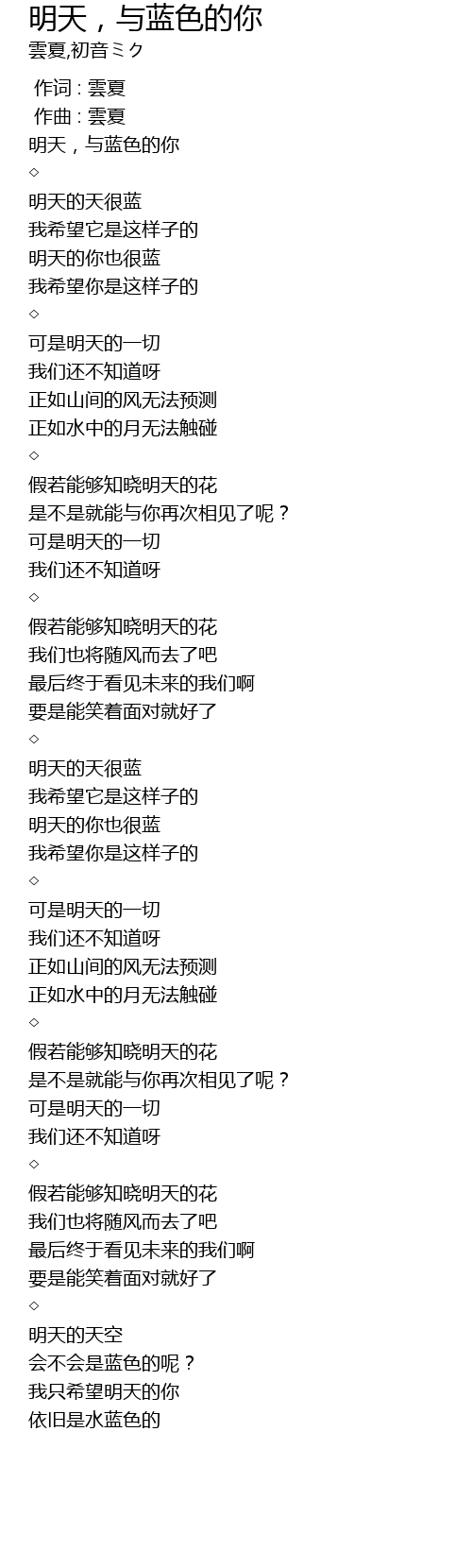 | [01:39.886] | míng tiān de tiān hěn lán |