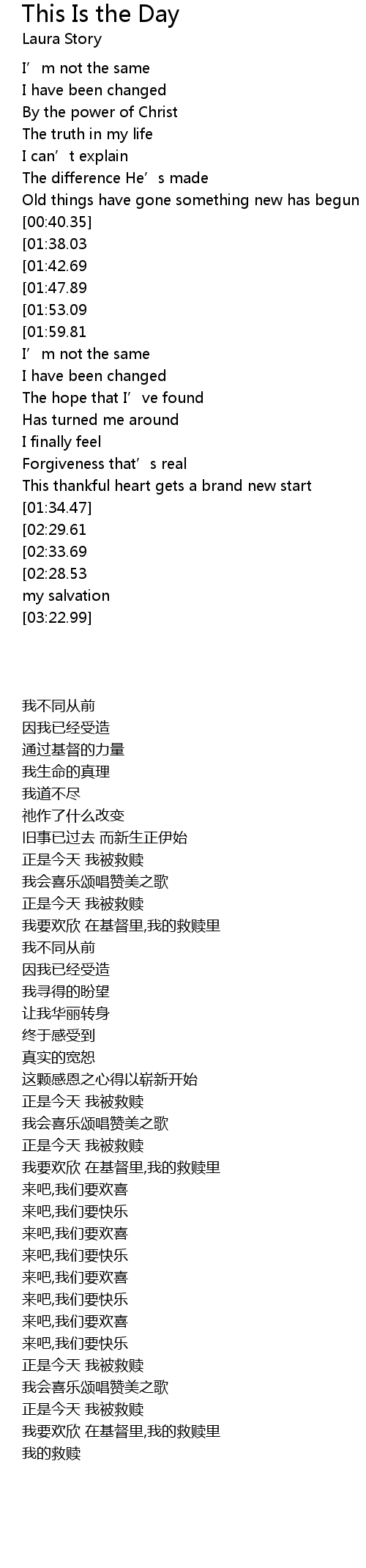 | [02:50.37][01:38.03][00:43.50] | This is the day of my salvation |