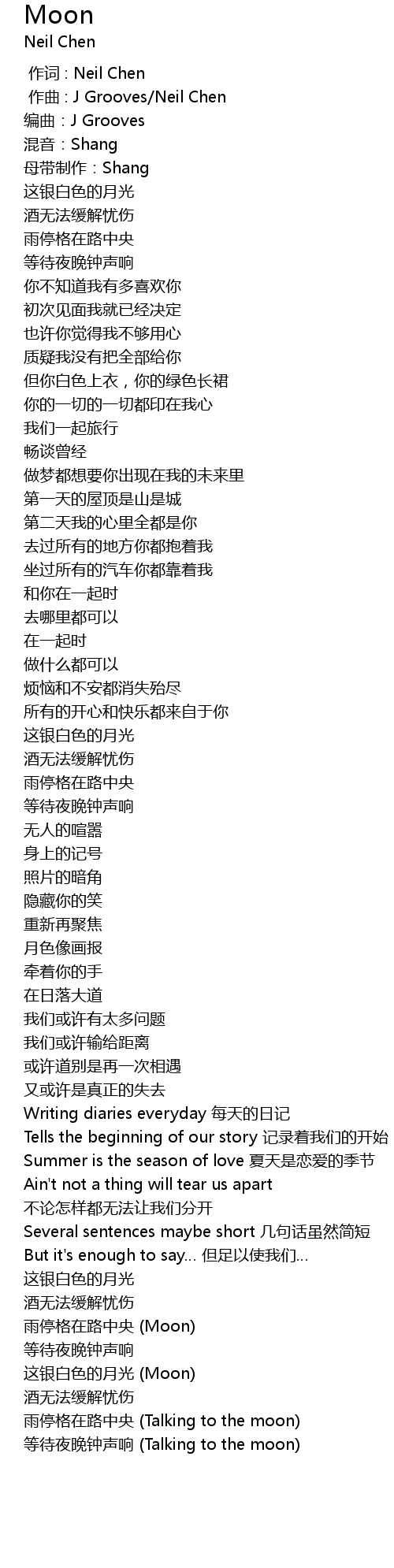 | [02:11.59] | 雨停格在路中央 (Moon) |