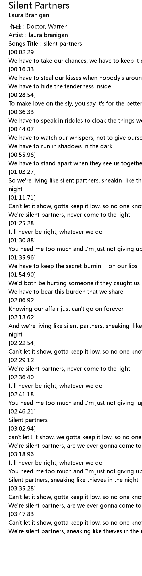 | [02:15.64] | And we' re living like silent partners, sneaking like thieves in the night |