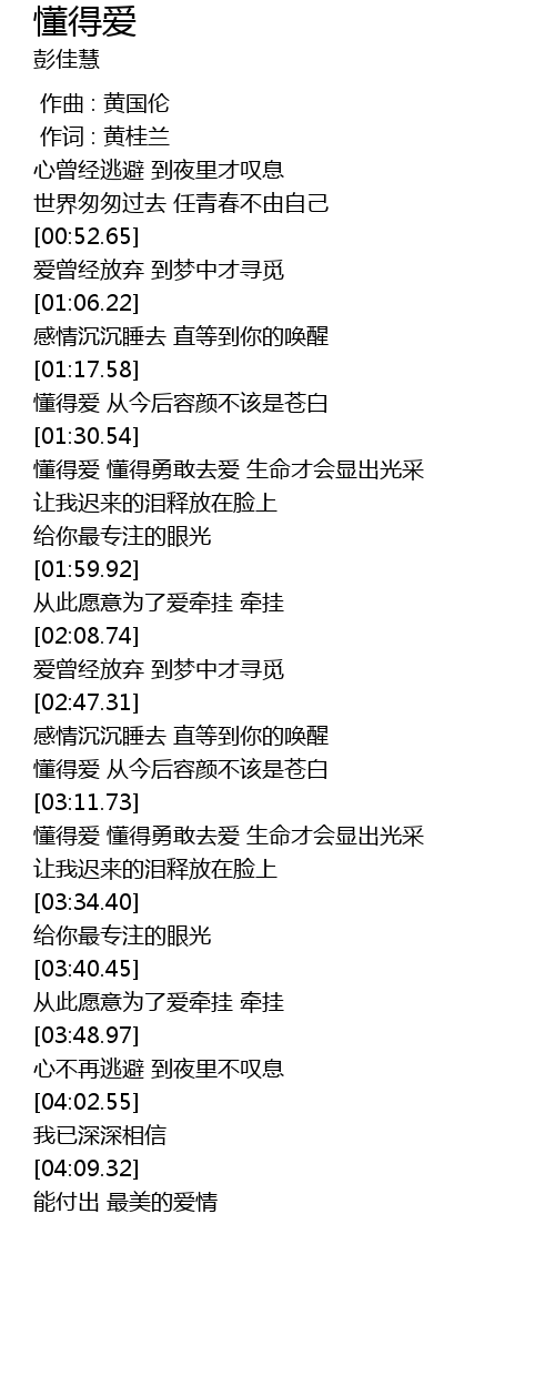 | [01:31.91] | 懂得爱 懂得勇敢去爱 生命才会显出光采 |