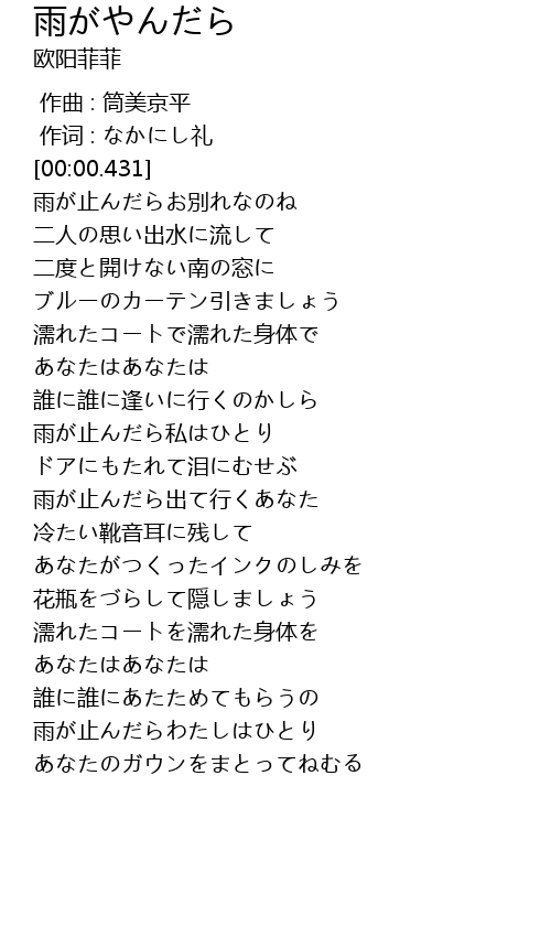 | [01:06.155] | 雨が止んだら私はひとり |
