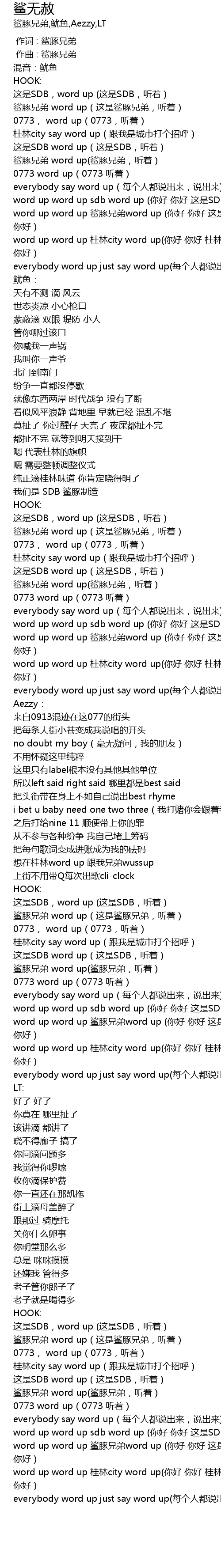 | [02:10.77] | word up word up 鲨豚兄弟word up (你好 你好 这是鲨豚兄弟 你好) |