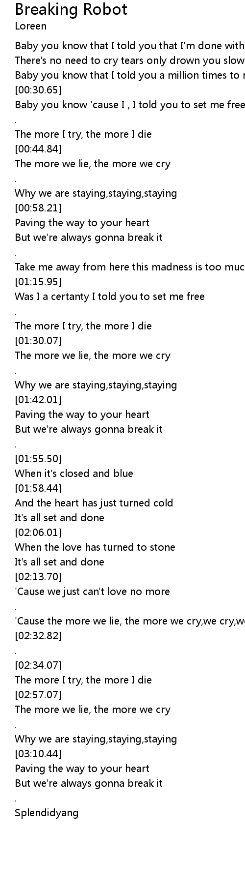 | [02:19.01] | 'Cause the more we lie, the more we cry,we cry,we cry,we cry |