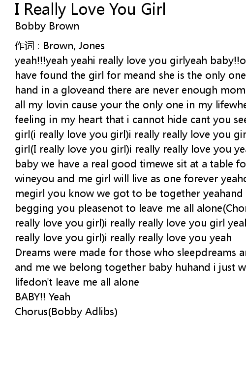 | yeah!!! yeah yeahi really love you girlyeah baby!! ohhhhh!!! verse 1 ohh i think i have found the girl for meand she is the only one i needwe fit together like a hand in a gloveand there are never enough moment when we make lovecan i give you all my lovin cause your the only one in my lifewhen you and me get such a feeling in my heart that i cannot hide cant you see chorus i really love my girl i really love you girl i really really love you girl yeah! i really love my girl I really love you girl i really really love you yeah verse 2 when we go out baby we have a real good timewe sit at a table for two candle light dinner and wineyou and me girl will live as one forever yeahohhhh love was made for you and megirl you know we got to be together yeahand i' ll get down on my kneesgirl im begging you pleasenot to leave me all alone Chorus i really love my girl i really love you girl i really really love you girl yeah! i really love my girl I really love you girl i really really love you yeah | |