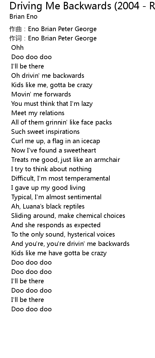 | [03:54.900] | And you' re, you' re drivin' me backwards |