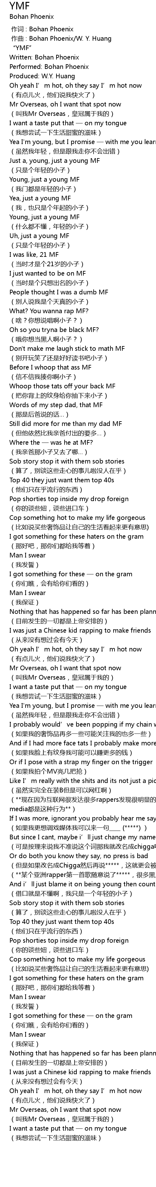 | [02:04.881] | (**某个亚洲rapper第一首歌随意说了*****,很多黑人不可思议亚洲人对白人歧视黑人的历史这么不敏感,但是因为这一点争论他受到了很多的讨论和关注**) |